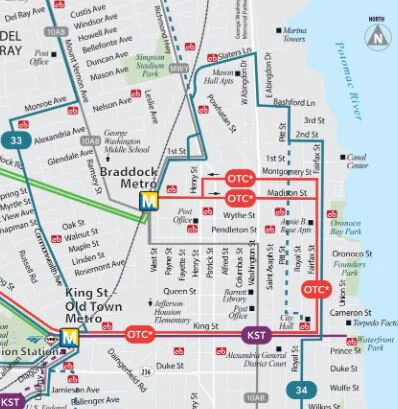 In Old Town North, a new Old Town Circulator route is planned, operating between King Street Metro and Braddock Road Metro via King Street, North Fairfax Street, and the Madison/Montgomery pair. Trips on the two new lines (30 and 31) serving the Circulator route will be coordinated so that they arrive at the King Street Metro in even intervals to create 5-15 minute headways.
