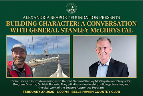 The evening will feature a “fireside chat” with Alexandria Seaport Foundation Director Matt Roberts and General McChrystal followed by a Q&A session. Your ticket includes a buffet dinner, drinks, and a signed copy of the book.