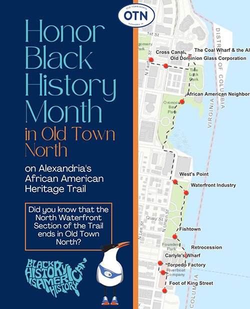 February is Black History Month. Did you know that the North Waterfront section of the African American Heritage Trail in Alexandria terminates in Old Town North? The Trail, created by the African American Heritage Trail Committee with the support of the Office of Historic Alexandria, was designed to illuminate the history of the African American Community in Alexandria. Start at the foot of King Street and work your way along the river north through Founders Park, Oronoco Bay Park, and Tide Lock Park to end at the corner of N. Fairfax St. and Montgomery St.